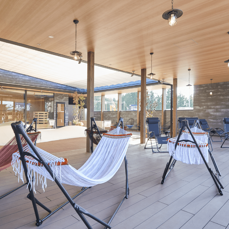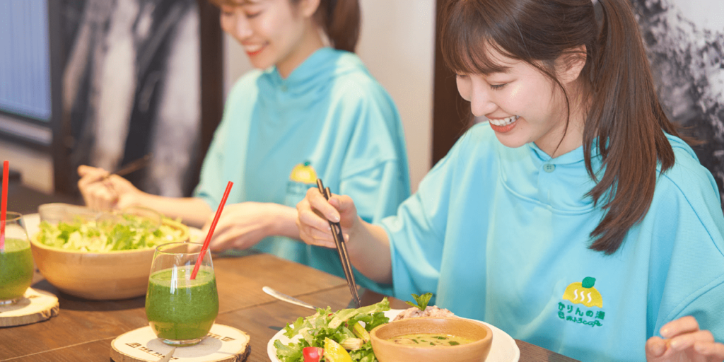 ザファーム食堂では、自社農園の食材を使用した料理や、おしゃれなスムージーが楽しめます。美味しい食事と温泉、サウナで癒された後には、ゆったりとした空間でくつろいで過ごすこともできます。